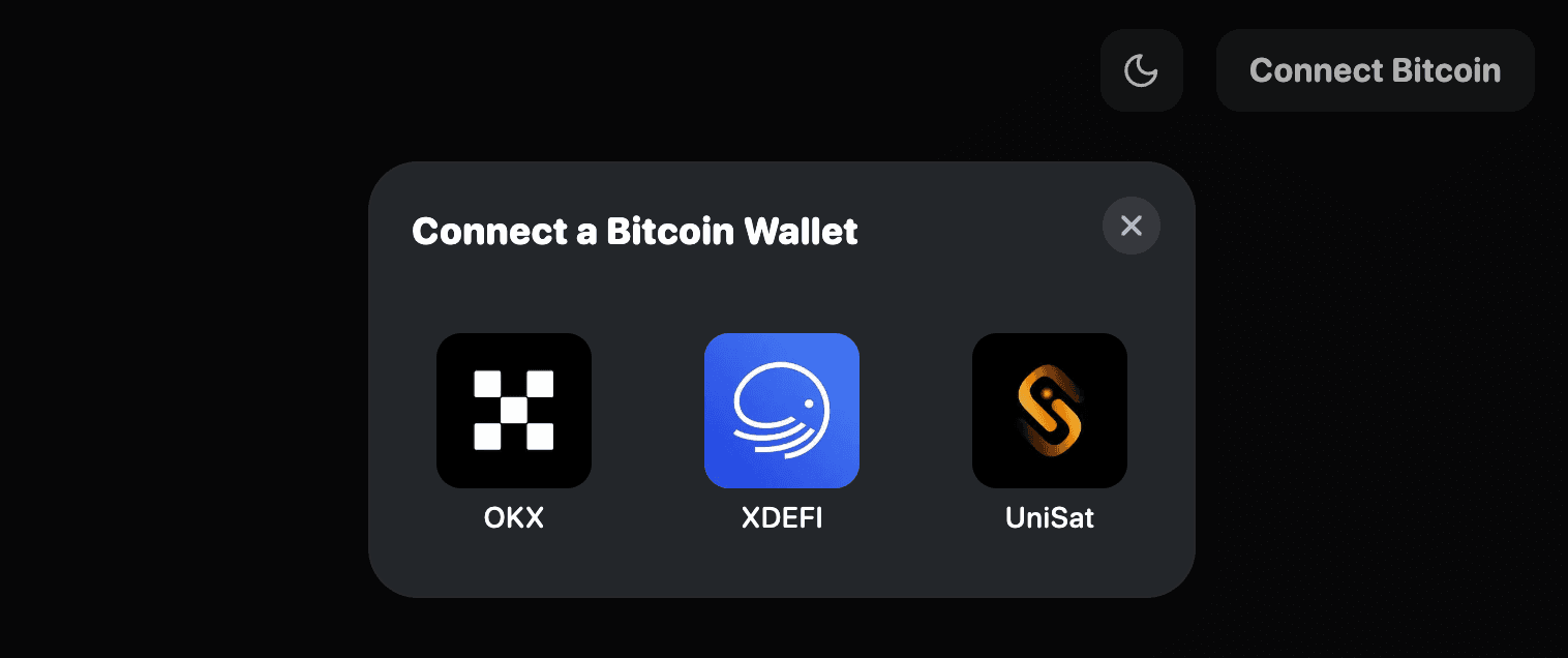 Connect Bitcoin is a component that allows users to connect their Bitcoin wallet to the application. Currently, OKX, XDEFI and UniSat wallets are supported.
